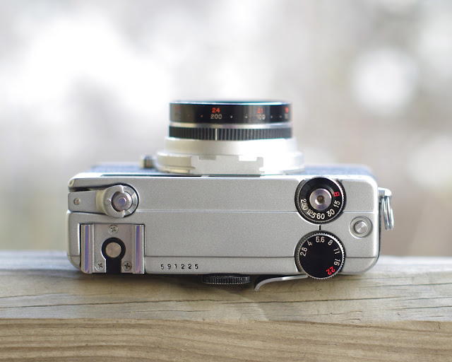 The Focus is adjusted with the dial that resides on the back of the body. The camera is a zone-focuser, just like the Rollei 35, but the distance scale on the Petri is located in the viewfinder, which is super cool and convenient. The camera also features a match-needle CDS exposure meter, but my battery compartment is unfortunately corroded shut.