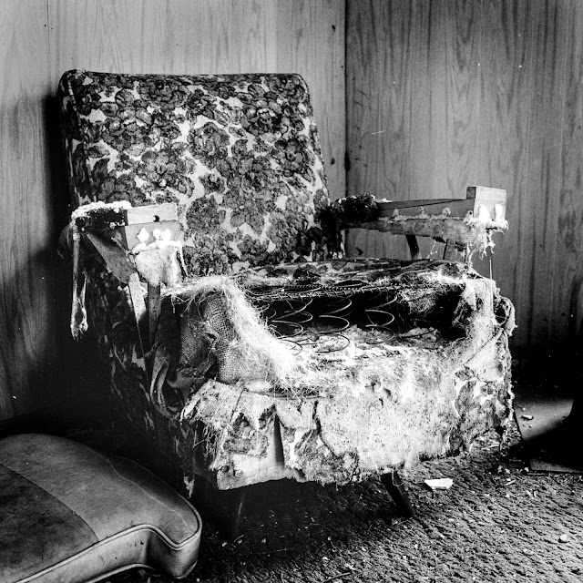 This well-worn armchair is in the sitting room of a large abandoned house off of State Line Road. The house is part of a homestead, complete with a barn, silo, and multiple small sheds. The entire place is completely overgrown; only the tip of the silo is visible from the road. I need to head back here sometime soon to document it further. I would have stayed longer on my first visit, but was scared off by a pickup truck that suddenly stopped not far away from where I was parked.