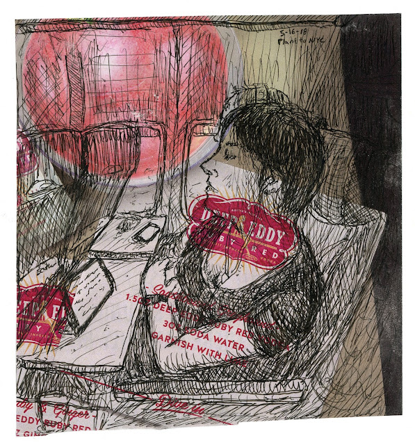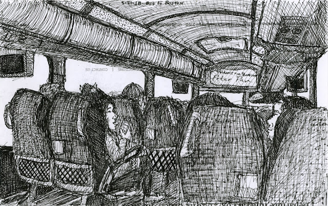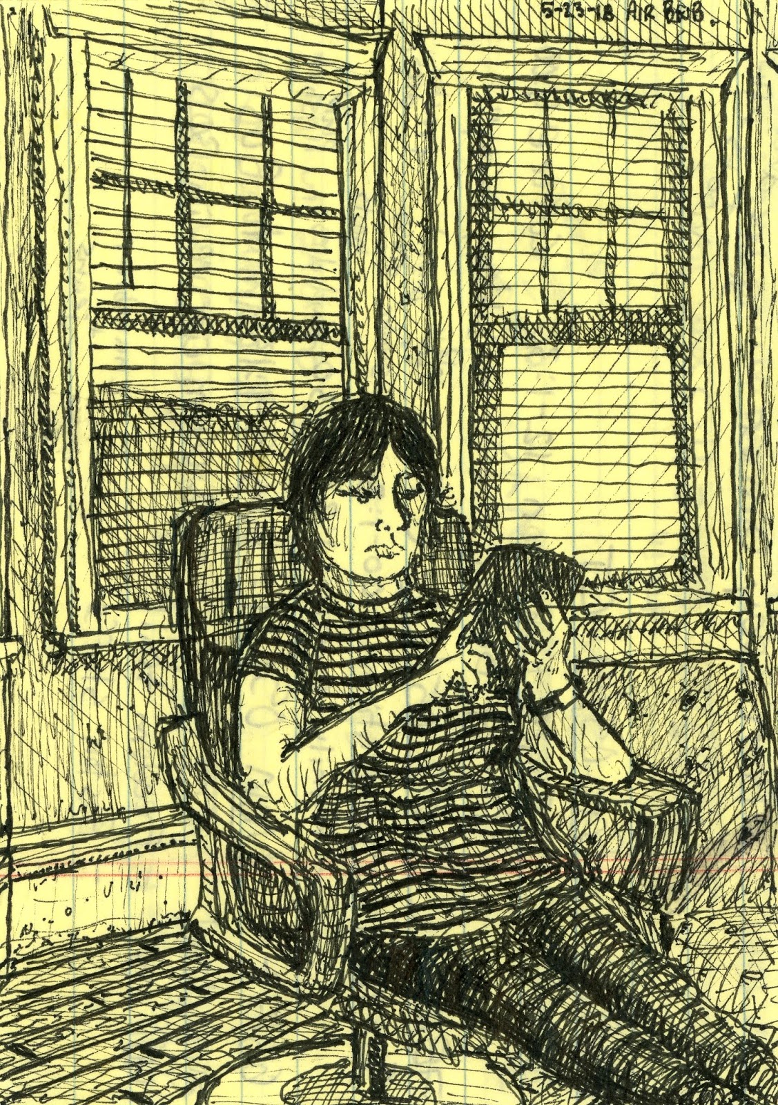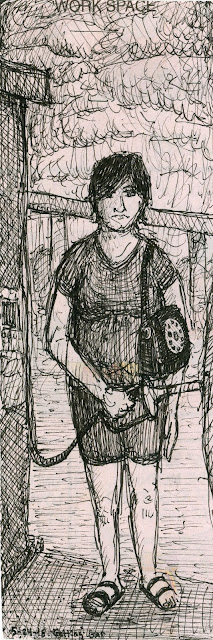 Woman Drawing, 5/29/18, Micron on Postcard