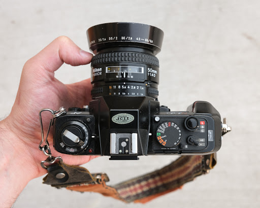 I love the design and layout of the N2020. No LCD screen bullshit, just a beautiful arrangement of tactile knobs and dials that do everything you need a camera to do. I always prefer dials over screens, not only because I'm a bit of a hipster, but because dials let you see your camera's current settings, even when the power is off. The N2020 is around the same size as a Nikon FM or FE, but with a nice little added grip that makes handling the camera a bit more comfortable.