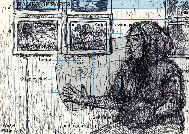 Katie Playing on Her Phone, 2/15/19, Pen on vintage camera guide